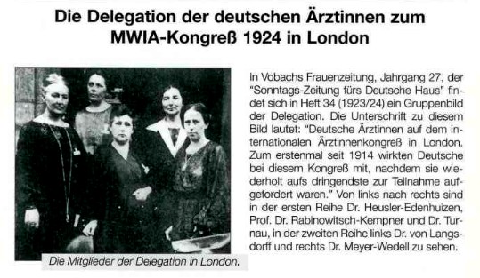 Auch auf internationaler Ebene war von Langsdorff engagiert: zum ersten Mal seit 1914 wirkten Frauen aus Deutschland beim Internationalen Ärztinnenkongress (Medical Women’s International Association MWIA) 1924 in London mit. Toni von Langsdorff gehörte zu den Delegierten.